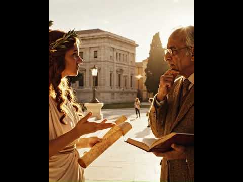 Create an image of the Greek goddess Clio debating with an academic, using